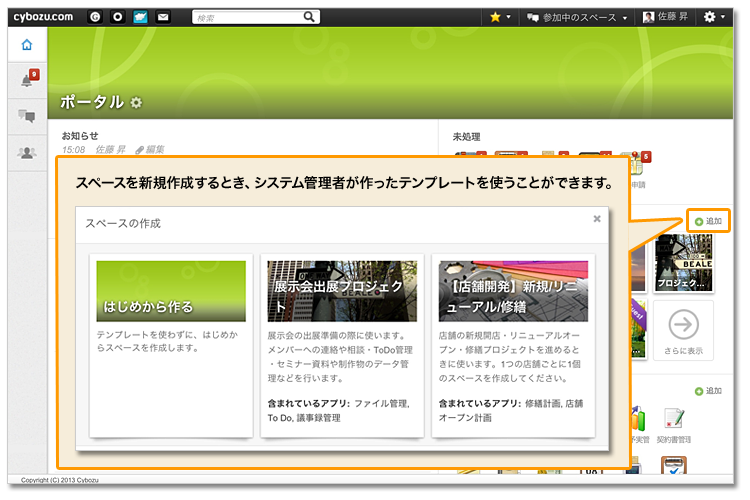 ※2013年11月時点では、サイボウズからのテンプレート提供は行っておりません。「kintone システム管理者」に設定されたユーザー自身で、テンプレートを作成します。