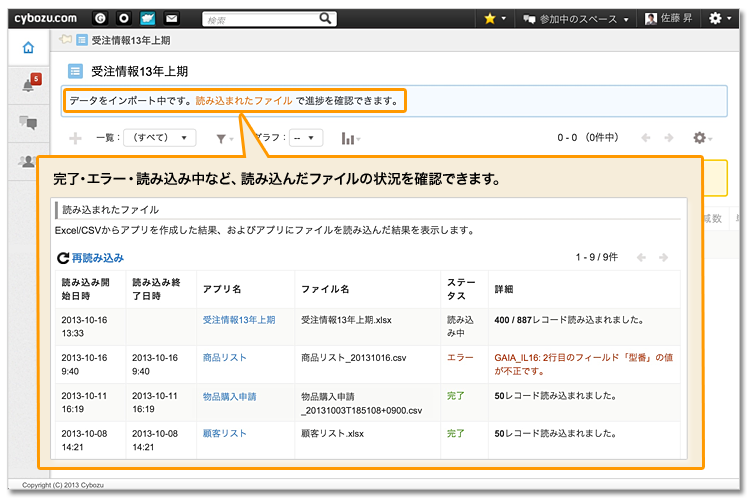 Excel / CSV ファイルからのアプリ作成や CSV ファイルの読み込みを行ったとき、進捗と結果を表示します。データ量の多いファイルを読み込んだ場合も、現在の状況を確認できるので安心です。