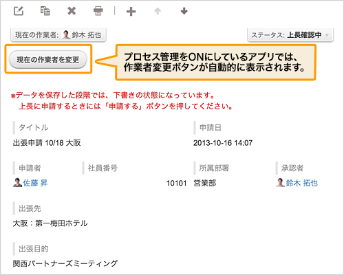 プロセス管理で、現在の作業者を変更できます(アプリ管理者のみ)。担当者が休暇中のときに申請をしてしまった、という場合も他の人にまわすことができます。