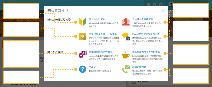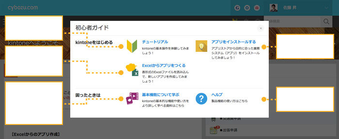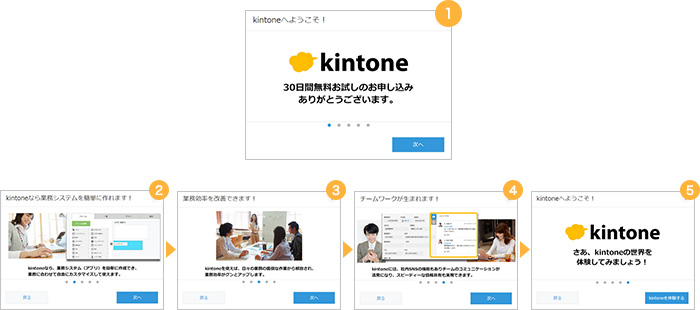 お試し中の環境ではじめてポータル画面を表示したユーザーに「ようこそダイアログ」が表示されるようになりました。「ようこそダイアログ」ではkintoneの概要を紹介します。