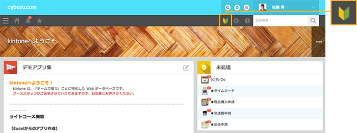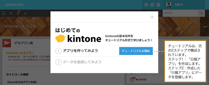「チュートリアル」では、kintoneでアプリを作る方法や、レコードを登録する操作について学べます。