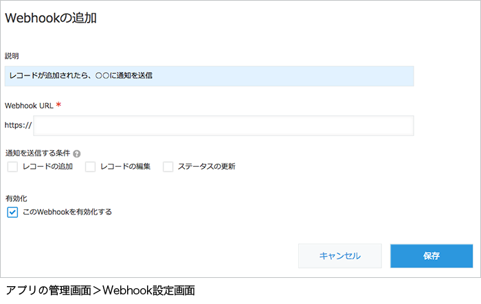 Webhookは、Webサービス同士が連携する仕組みです。kintoneでイベントが実行されると、外部サービスに通知します。 Webhook機能を使うと、アプリへのレコード追加、編集、ステータスの更新を外部サービスに通知できます。