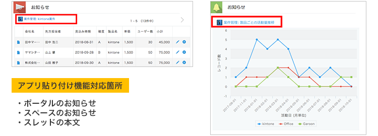 お知らせのアプリ貼り付け機能を改善し、貼り付けている一覧名・グラフ名を表示するようになります。