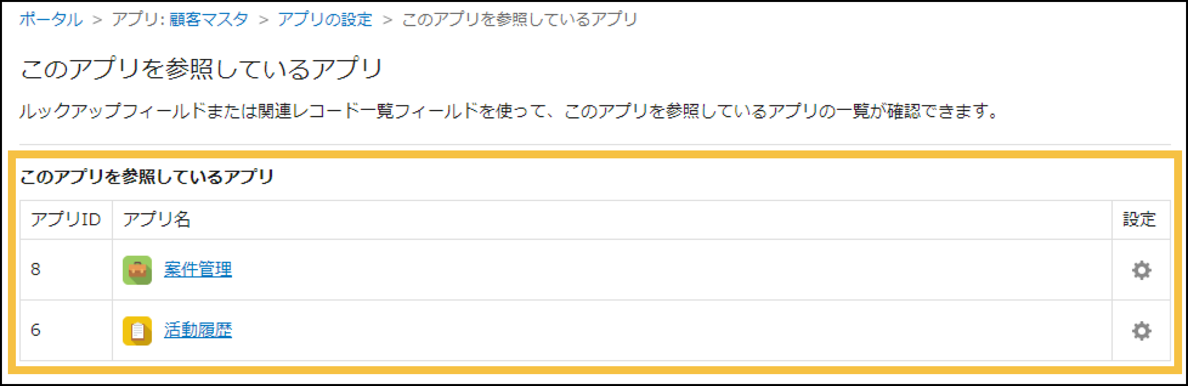 顧客マスタアプリの設定内で、顧客マスタアプリを、ルックアップまたは関連レコード一覧で参照しているアプリの一覧が表示されます。