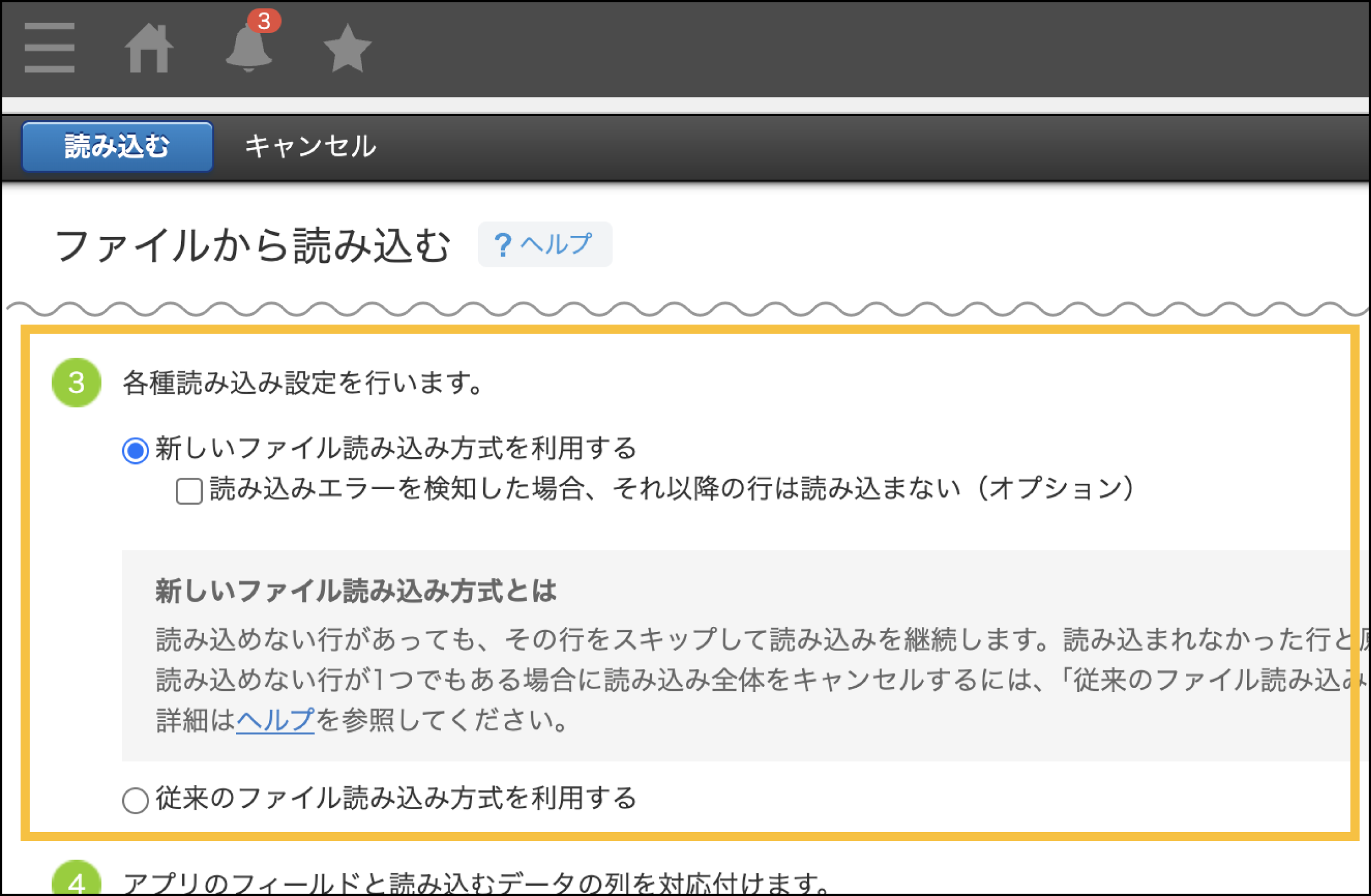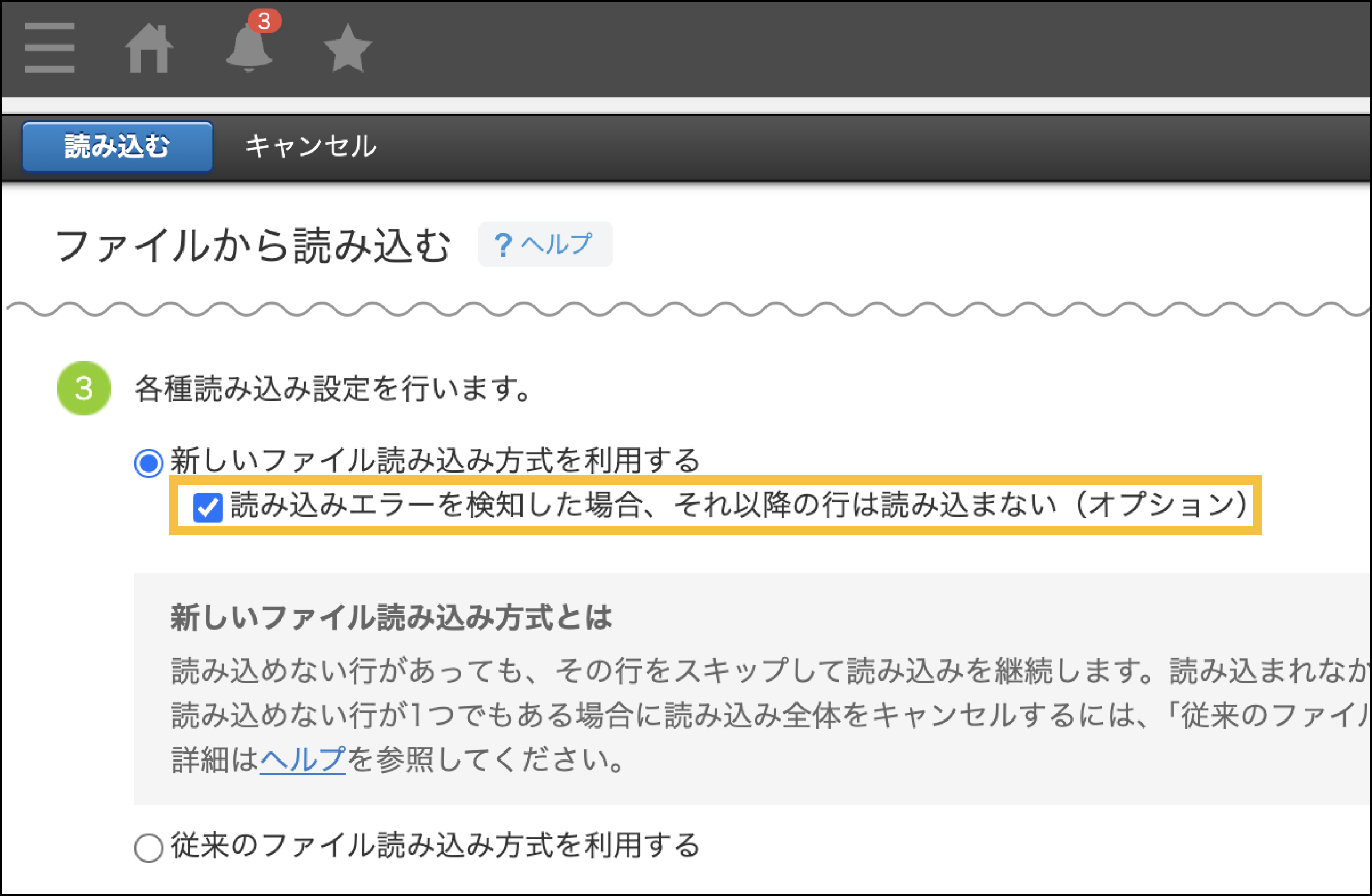 「読み込みエラーを検知した場合、それ以降の行は読み込まない」オプションを利用する場合