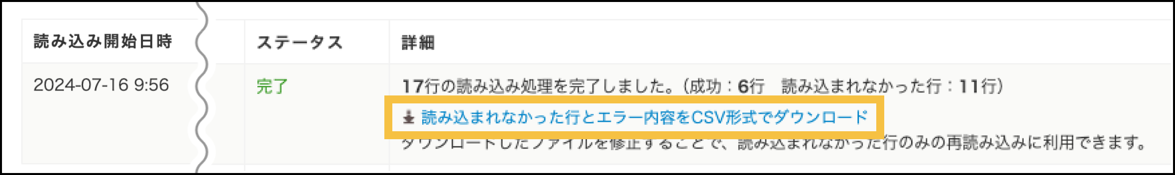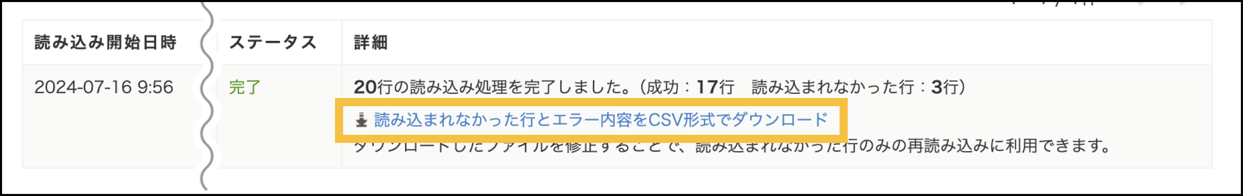 読み込みに失敗した行がある場合、CSVのダウンロードリンクが表示されます。CSVには、読み込んだファイルの全行のうち読み込まれなかった行が、発生したエラー内容と共に記載されるため、このCSVファイルをもとに修正し、そのまま再読み込みすることが可能です。
