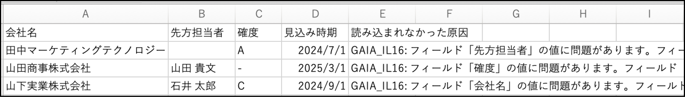 読み込みエラーを検知した場合、読み込みが中止され、CSVのダウンロードリンクが表示されます。CSVには、読み込まれなかった行(エラー行と、それ以降読み込まれなかった行)が、読み込まれなかった原因と共に記載されるため、このCSVファイルをもとに修正し、そのまま再読み込みすることが可能です。