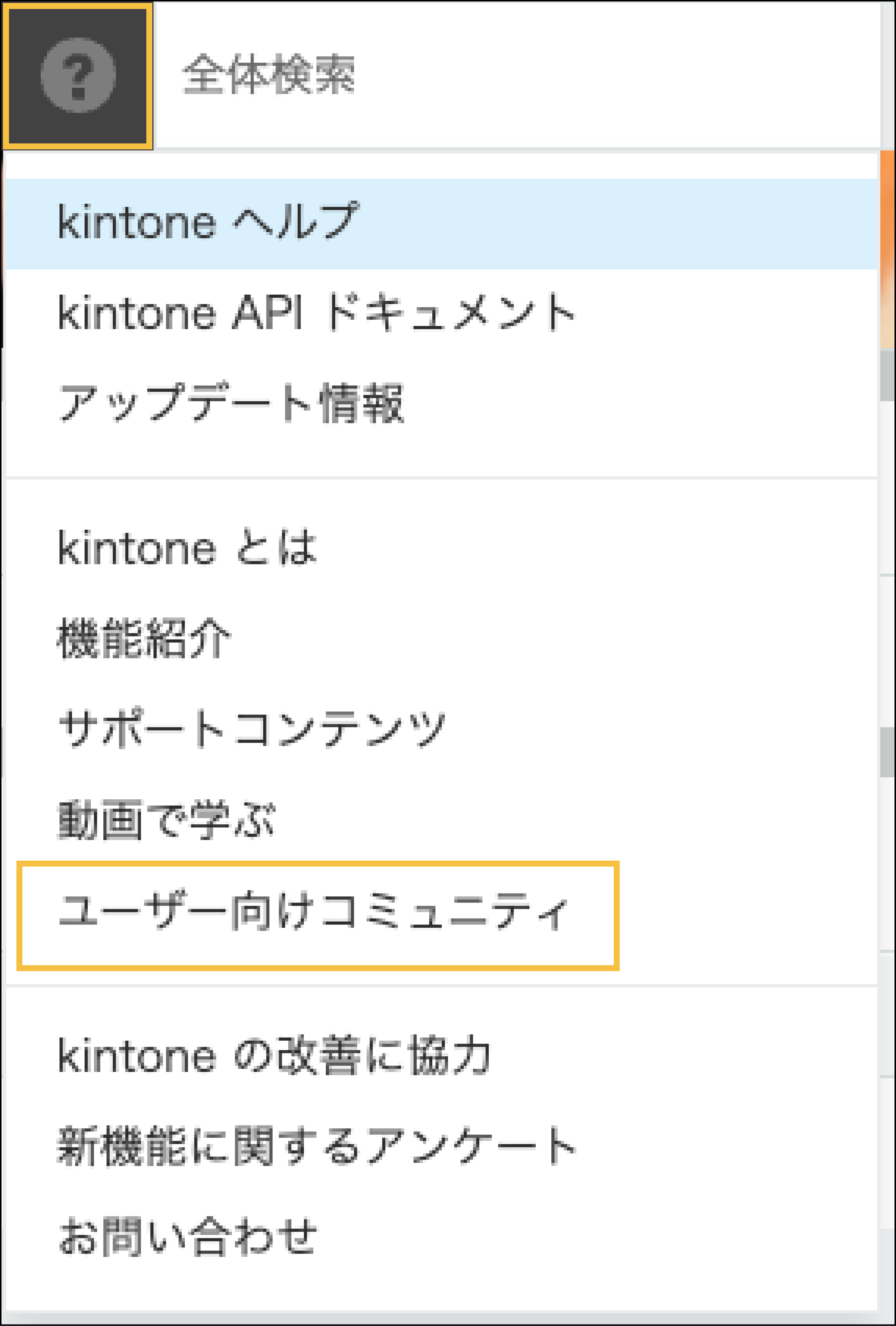 製品内の画面上部のヘルプアイコンからkintoneユーザー向けオンラインコミュニティサイト 「キンコミ」 を開けるようになりました。ぜひご利用ください。
