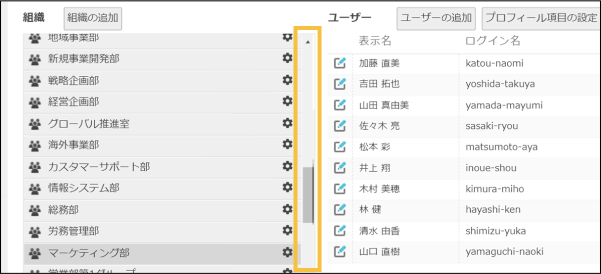 「組織とユーザーの設定」画面で組織の一覧をスクロールできるようになり、組織が多い場合でも組織やその組織に所属するユーザーに対する操作が行いやすくなりました。